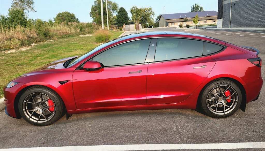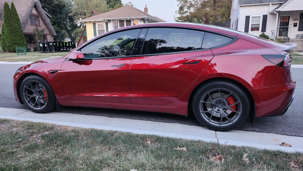 Our 18x7.5" +22 wheels, weighing less than 17.5 lbs, are the ideal choice for drivers looking to get the most efficiency out of their Tesla Model 3 or Model Y. The narrower and lighter design helps reduce rolling resistance and extend range, while maintaining comfort and stability. This size is especially popular among those downsizing from larger wheels, such as the 21-inch wheels on the Model Y Performance or the 20-inch wheels on the Model 3 Performance (including the 2024 Highland). Even with the larger Performance brakes, these wheels fit flawlessly without any rubbing or clearance issues, as shown in the picture below.