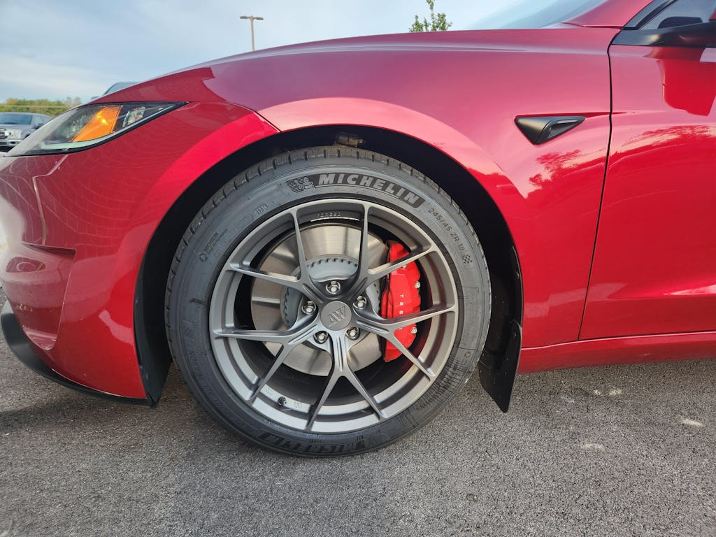 Our 18x9.5" +35 wheels, weighing just 18.9 lbs, are the perfect choice for drivers seeking a wider 18-inch setup for enhanced grip and performance. The broader design allows for wider tires, improving traction and cornering stability, while still offering an excellent weight for this size. This configuration is a popular upgrade for those wanting more aggressive handling without sacrificing efficiency. Even with the larger Performance brakes, these wheels fit perfectly on the Tesla Model 3 and Model Y, with no rubbing or clearance issues, as shown in the picture below.